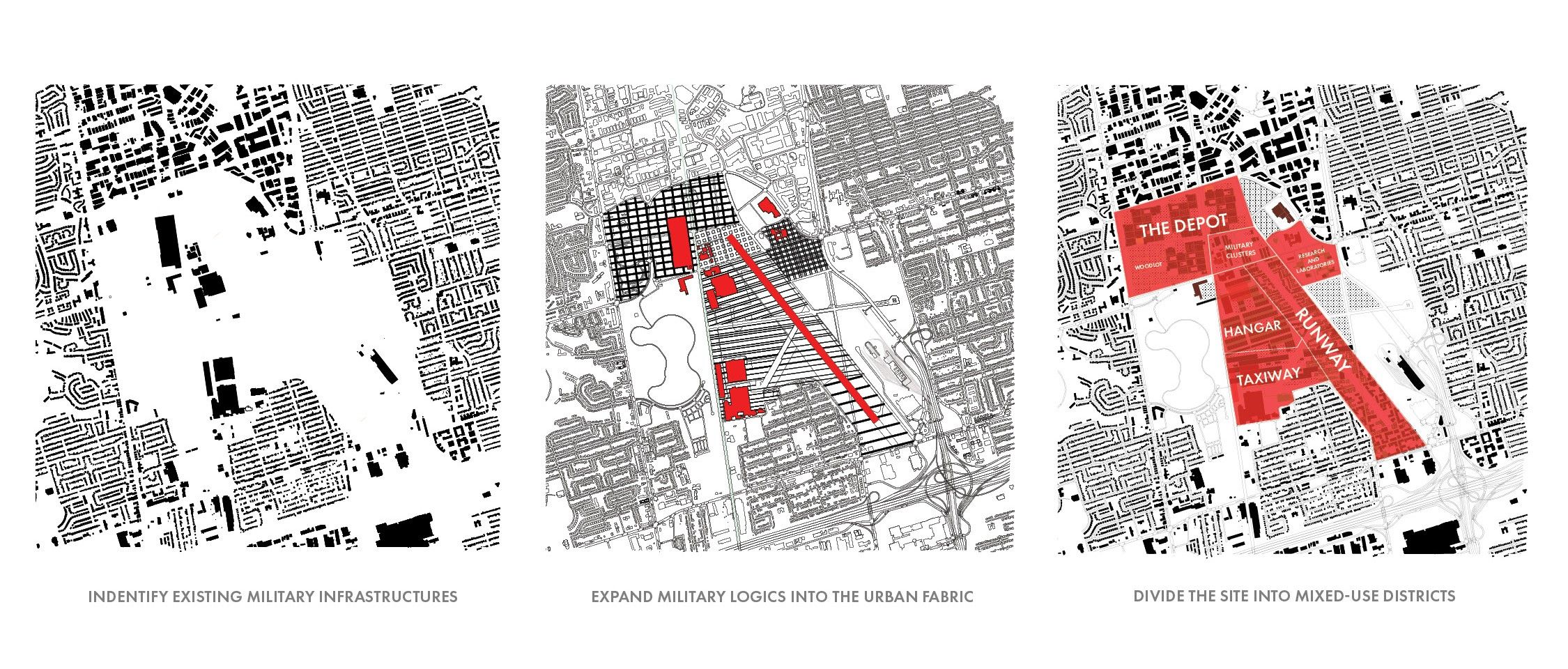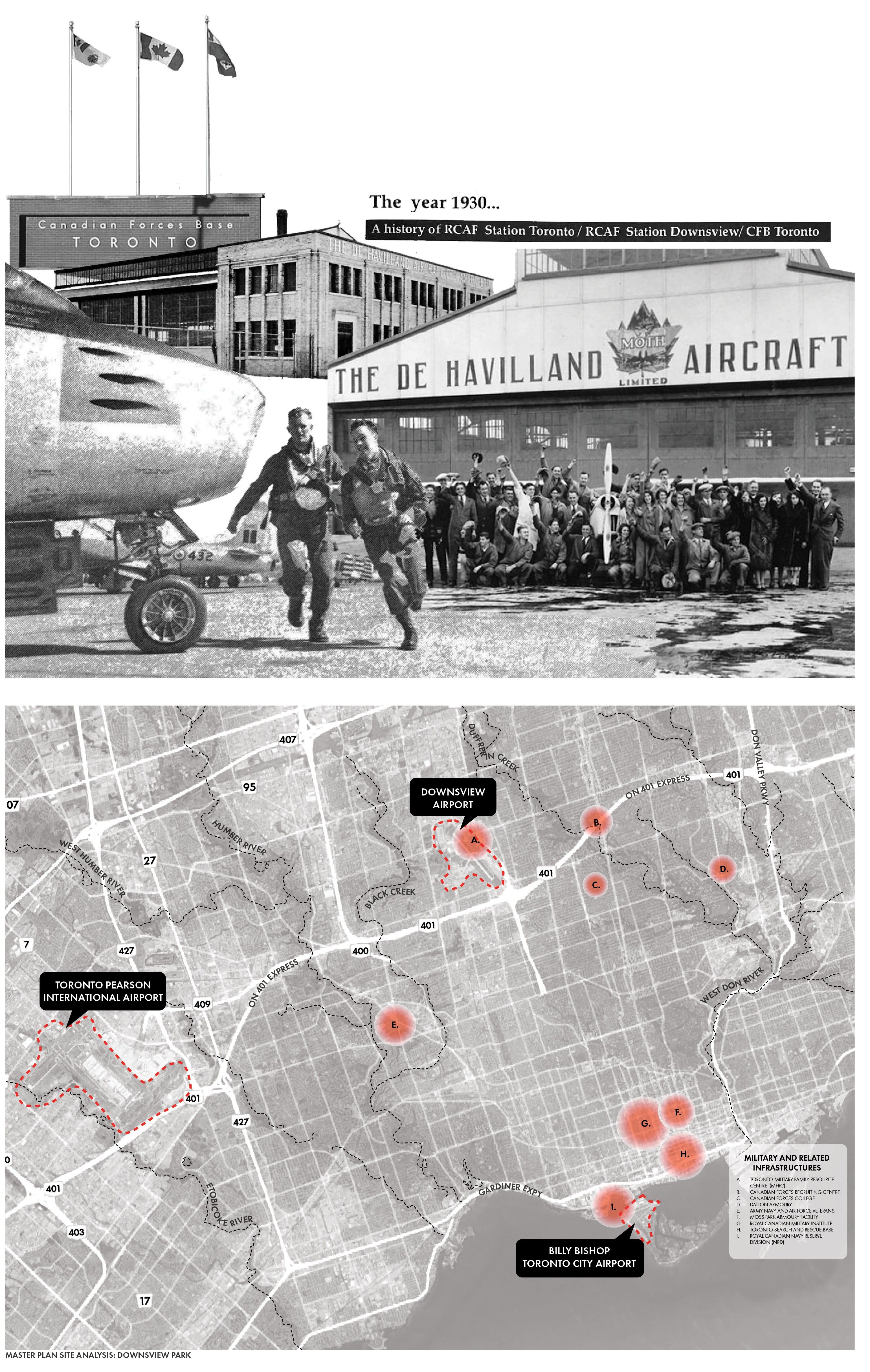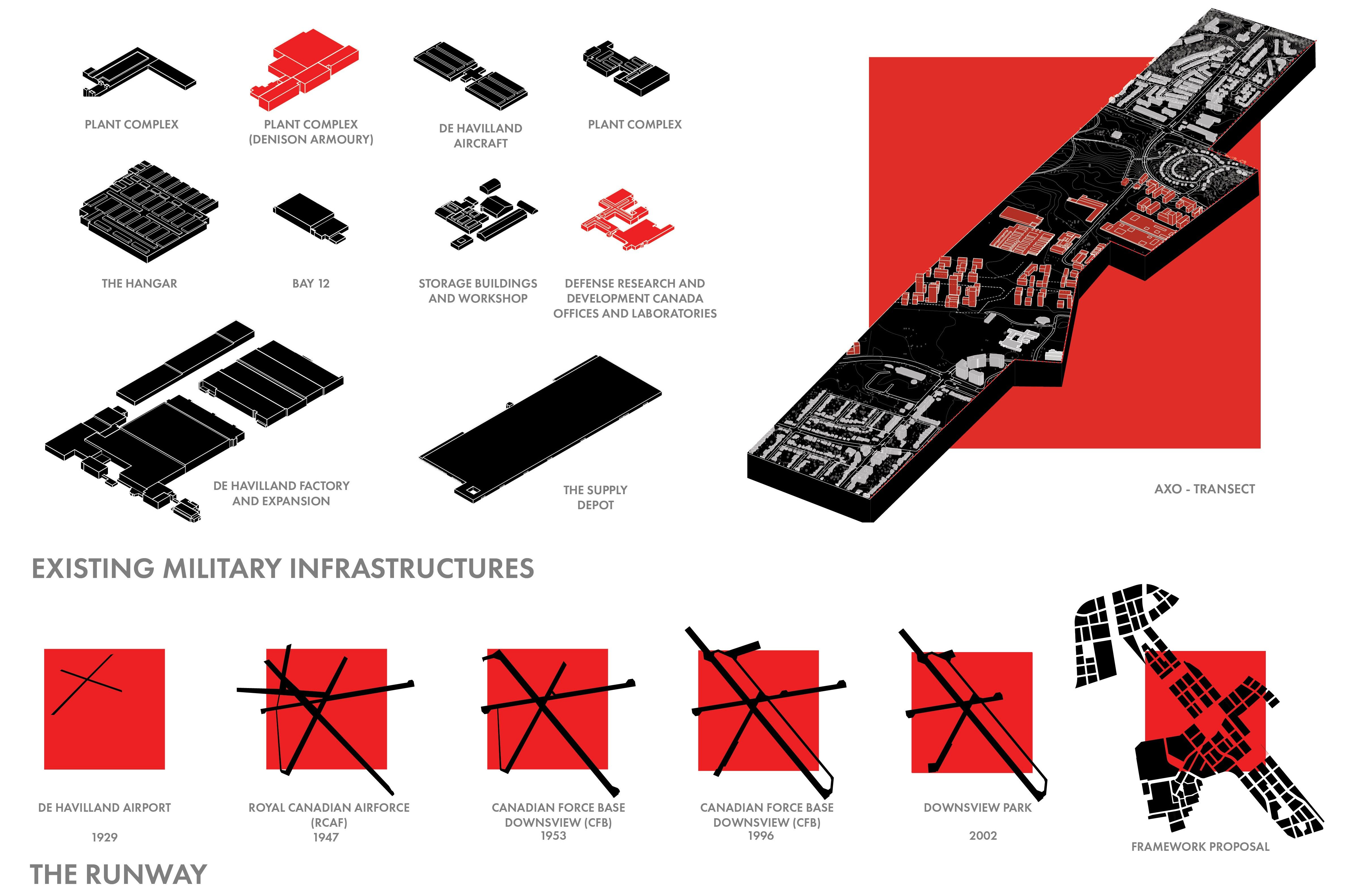 The military has long shaped cities through defense, logistics, and large-scale development. Downsview, once home to the de Havilland aircraft plant and a major airbase, reflects this legacy. As climate change and disasters intensify, the military’s role is evolving toward disaster relief and resilience. This project reimagines Downsview as a civic-military hub, combining sustainable military housing, emergency response infrastructure, and climate research.